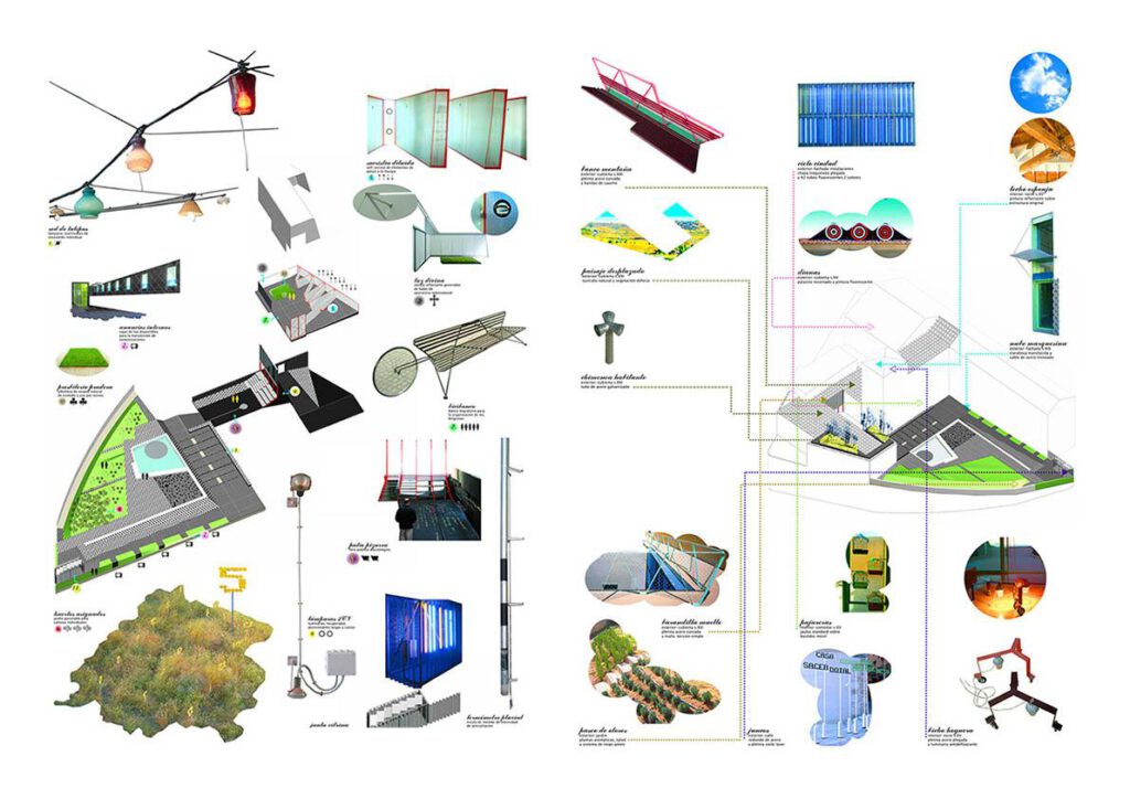 - Transferences: the synthesis and concentration of binding elements with the landscape (cutouts from ecosystems: cork oaks meadow and a pool, valley of cherry trees, gardens of lemon trees; memory objects: banks, books, tents, clouds, lamps, chimneys…) through low-tech devices.