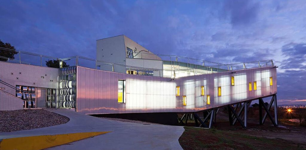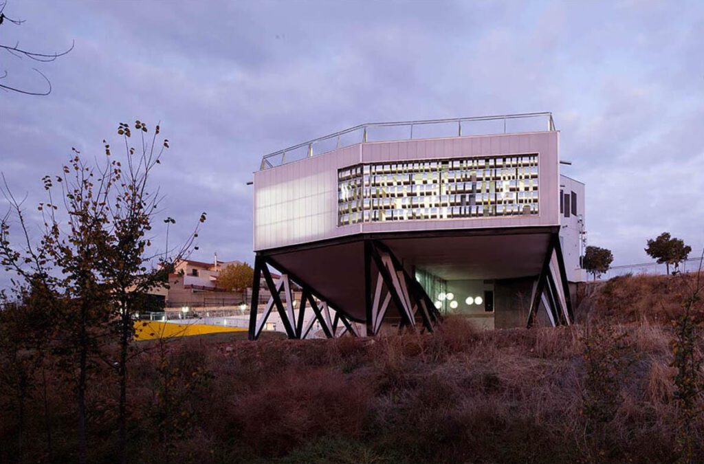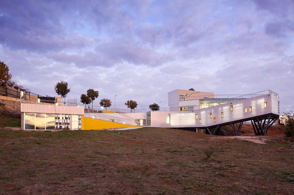 The Youth Center is the newest creative and recreational landmark in Cabanillas del Campo. Emerging only partly from the ground, the building develops most of its functions at lower levels, which face the river and new developments. The volume unfolds along the existing slope, enabling a pedestrian connection between the two levels through the continuous, accessible roof. A similar circulation occurs in the interior, a staggered space with specific functions within a seamless ambiance.