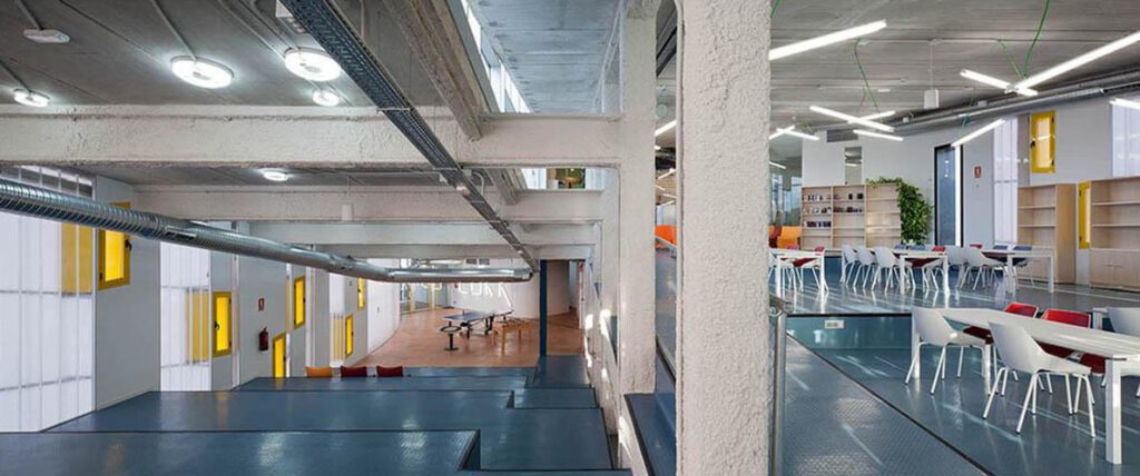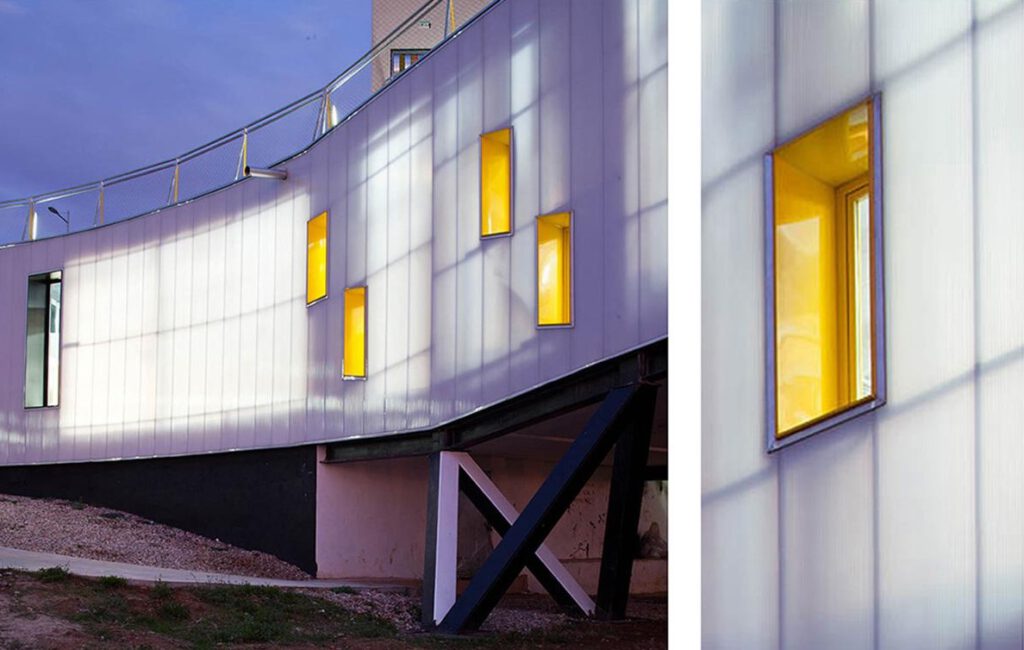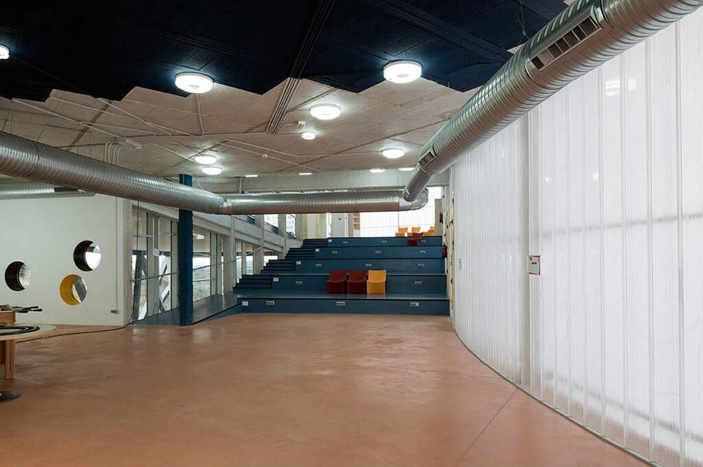 The building houses an open program: reading area, playroom, associations, classrooms, workshops, performance rooms… flexible enough to encourage the incorporation of new uses, within a changing environment that aims to achieve a high degree of self-management. The western end of the building raises over the planned park along the banks, generating a large covered outdoor space with great potential of attraction, a milestone in the sequence of open spaces along the creek.